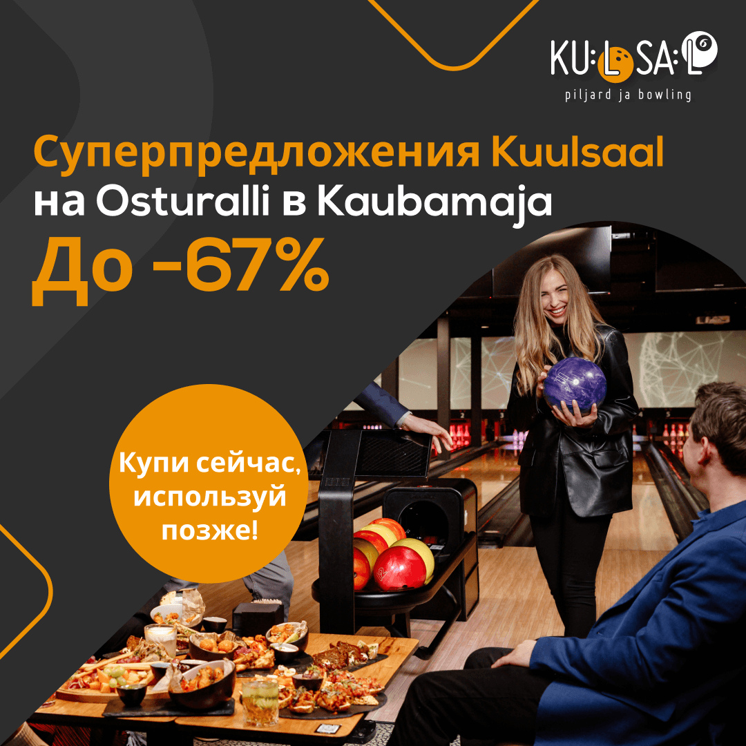 Во время Osturalli в Kaubamaja вы можете приобрести праздничные пакеты Kuulsaal, а также подарочные карты на боулинг и бильярд со скидкой до –67%!